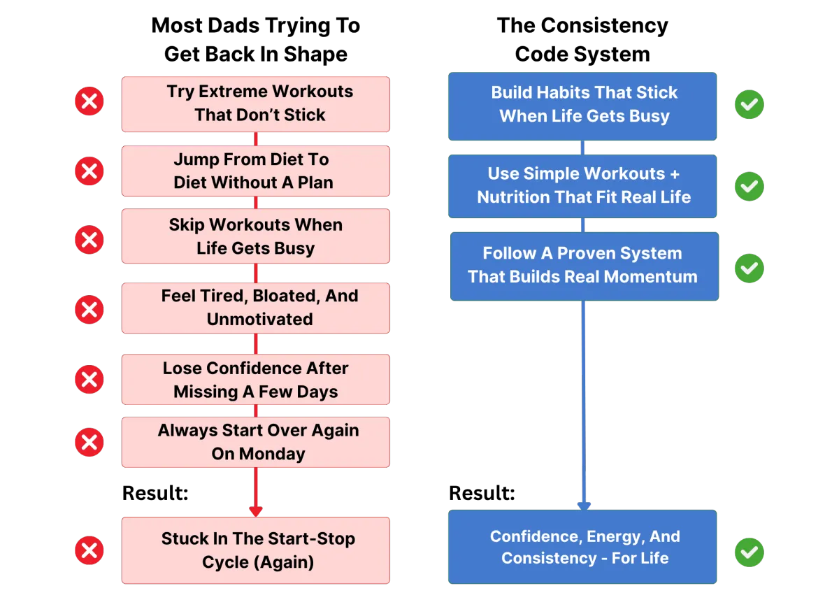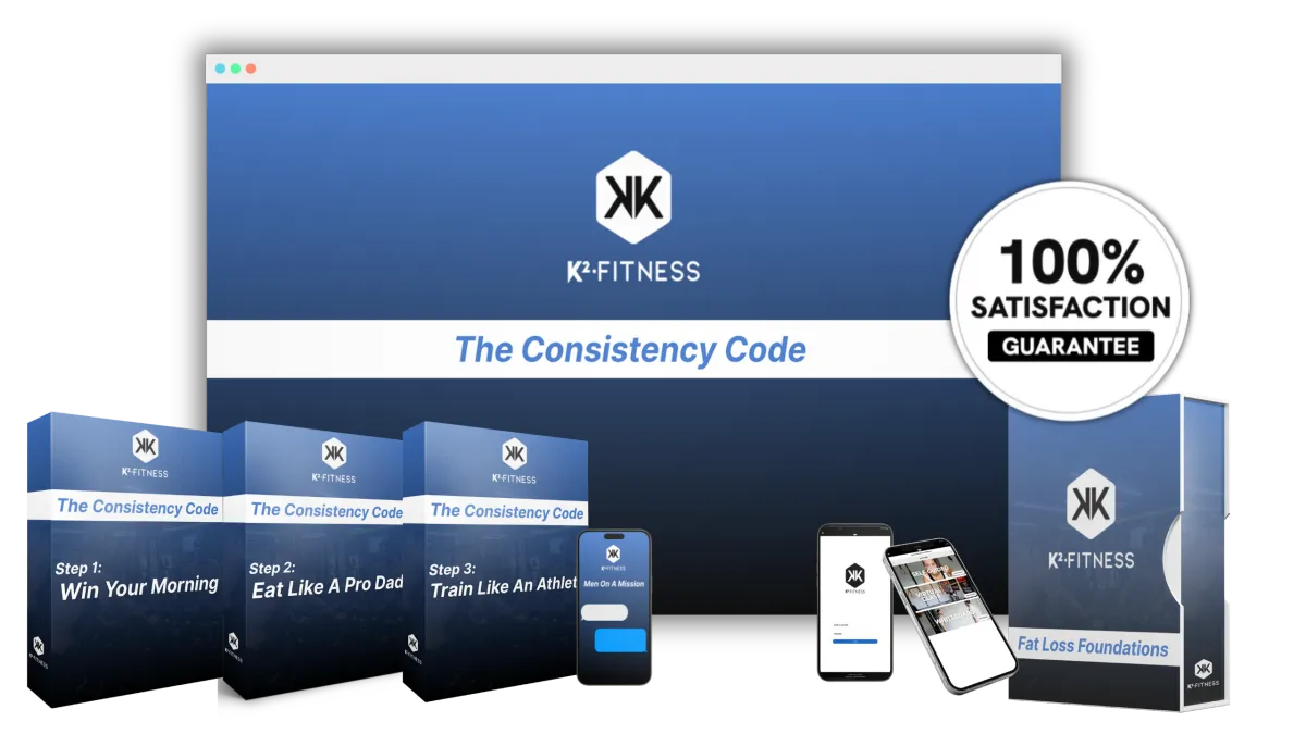 The Consistency Code is a 3-day fitness and nutrition jumpstart built for busy dads who want to get lean, strong, and confident again — without needing a gym, crazy diets, or 90-minute workouts.